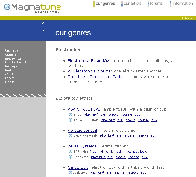 Where am I? — a graphic logo on the top left or top right does the trick. It's even better if you have a catchy line. For Magnatune, it's “We are not evil”.