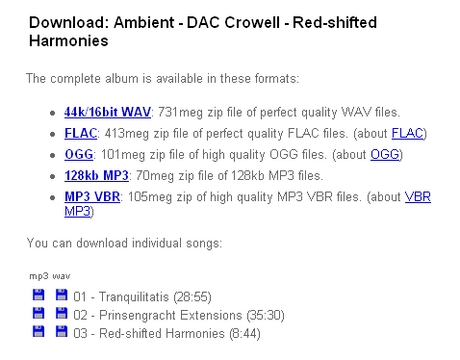 We sell only downloads and never use digital rights management (DRM). Purchasers may download albums as perfect-quality WAV or FLAC files, as high-quality variable bit-rate Ogg Vorbis files or MP3s or as 128k MP3s. Buyers can choose how much they want to pay, from $5 to $18 US.