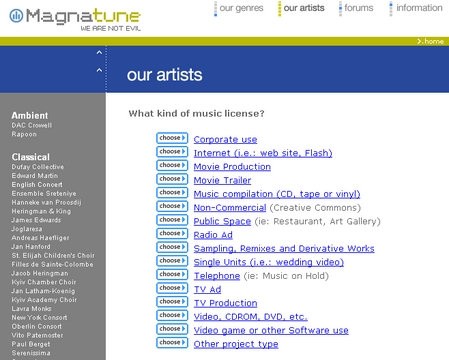 Clicking the License button next to any album brings up a page (see Figure 5) with the question “what kind of music license?” Sixteen different scenarios are displayed, such as Movie Use, Radio Advertising, Web Site, CD Compilations and even On-Hold Music for telephone systems. The connected page outlines the relevant variables for that scenario, and a price quote is given. The user enters the project details and then is sent to a Check Out page with a music license agreement, which is valid as soon as the fee is paid.