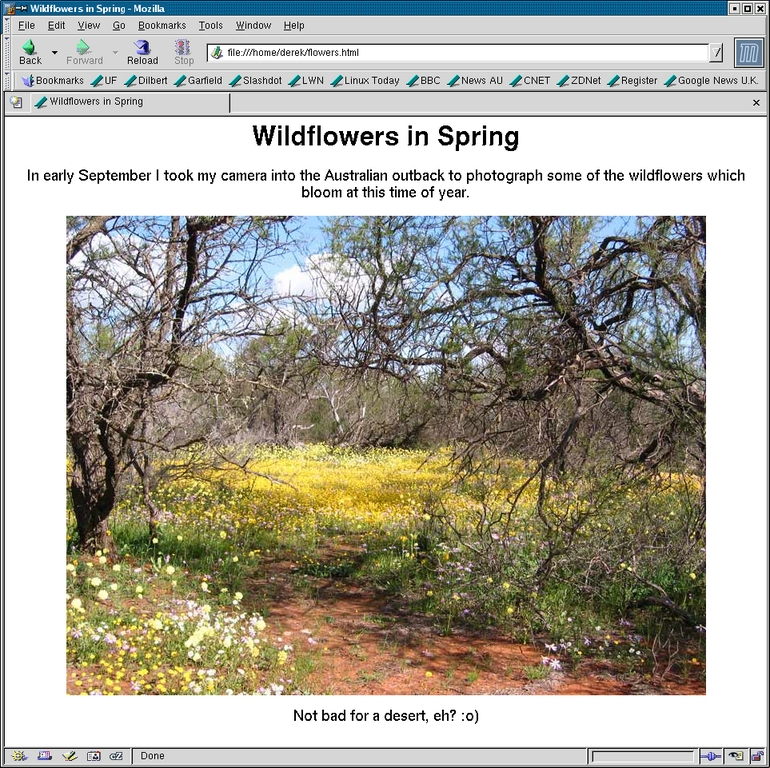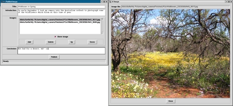 In order to test-drive the latest versions of Tcl/Tk and Visual Tcl, I needed a small project to develop. A personal requirement provided just the thing. Since getting a digital camera, I've often wanted to throw a couple of pictures onto a Web page quickly so that friends and family could see them. A full-blown Web gallery application would be overkill; I need only the ability to select one or two image files, add a few lines of text and then have a single Web page appear that I can upload to a Web server. Figure 1 shows an example of the sort of page I would like to be able to produce.