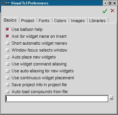 Visual Tcl provides exactly these sorts of facilities and then some. In fact, it doesn't seem too sure whether to behave like a cut-down integrated development environment (IDE). It occasionally offers a text editing window where the user can write the Tcl code that forms the actual application, rather than limiting itself to dealing with the development of the GUI. On the other hand, it doesn't offer a debugger or other traditional IDE features, so it's difficult to justify calling it a real IDE. I dealt with this confusion of personality by going into the configuration dialog for the application and switching off many of the features that seem to get in my way (Figure 3).