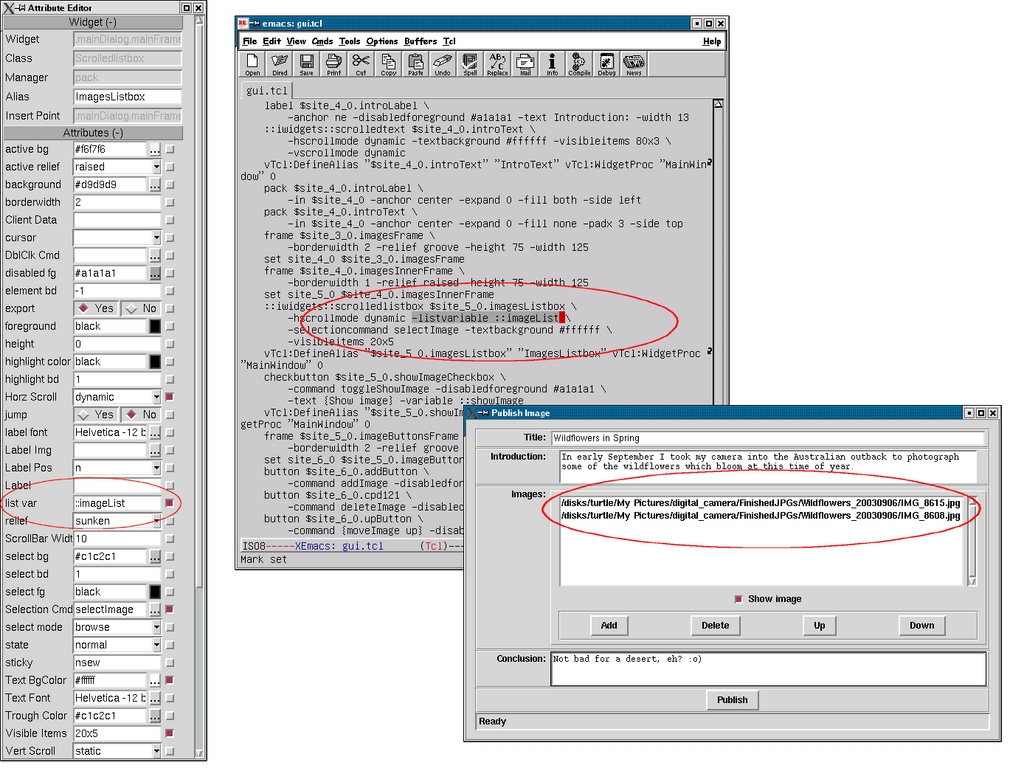 Figure 5. Setting the listvar attribute in Visual Tcl (left) ensures the generated code (middle) causes the onscreen widget (right) to respond immediately to any changes made in the named variable.