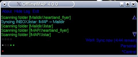 With the Tk.Blinkenlights interface, you can click on the Sync immediately button to force the account to synchronize right away. You can do the same thing in the Curses.Blinkenlights interface by pressing the number next to the account name. Both interfaces display a log of current activities. You also get a mesmerizing display of flashing status lights so you won't get bored while watching the synchronization happen.