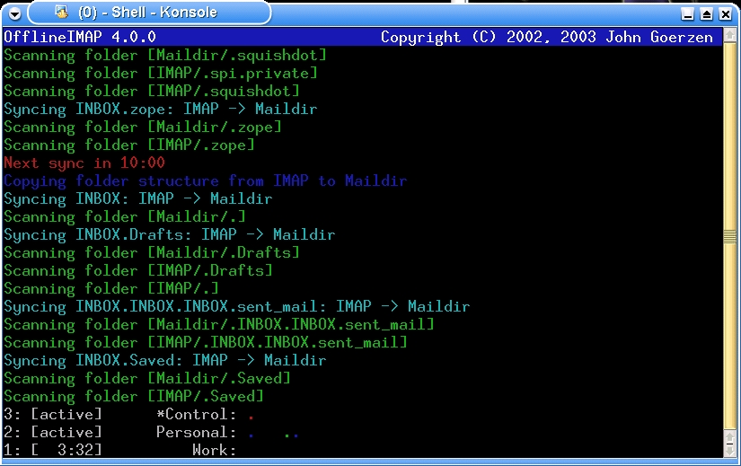 OfflineIMAP ships with many different user interfaces. The two most common are Tk.Blinkenlights and Curses.Blinkenlights. The former presents a small graphical window on OfflineIMAP's progress on your X desktop. The latter runs in a terminal and provides a nice monitor of progress (see Figures 1 and 2).