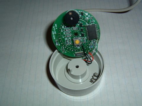 After opening up the lamp device, making sure not to lose the spring that easily pops out when unscrewing the device, the circuit board can be inspected (Figure 2). Using an ohmmeter, or any kind of device for detecting a closed circuit, it was determined that the three different LEDs are connected to the first three pins of port 1 on the main controller chip.