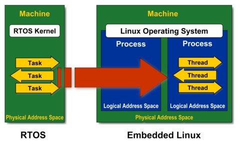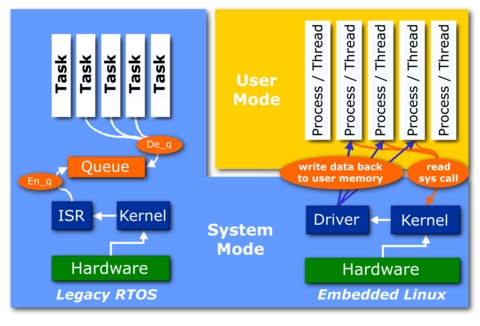 RTOSes are egalitarian, letting application and I/O code touch any address and perform almost any activity, whereas Linux is much more hierarchical and restrictive.