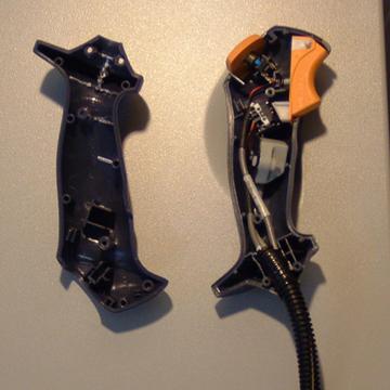 In addition to the graphics and displays, we used a Polhemus magnetic tracking system in the gestural interface as an alternative to a mouse interface. A Logitech Wingman joystick was re-engineered for use as a gestural input device. Figure 4 shows the inside of the joystick. A tracking sensor is embedded in the grip of the joystick. Communication with the computer is achieved by remapping standard serial mice and wiring them to the buttons within the joystick. The computer interprets the joystick button presses as mouse clicks.