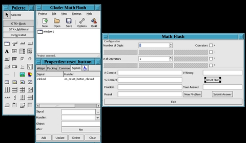 I saved the Glade file as mathflash.glade. Glade does not ask if you want to save your file, so you need to remember to save it before quitting if you make any changes to your interface. See Figure 1 for a screenshot of the interface and Glade. It shows the reset_button is configured to call the function on_reset_button_clicked when the button is clicked.