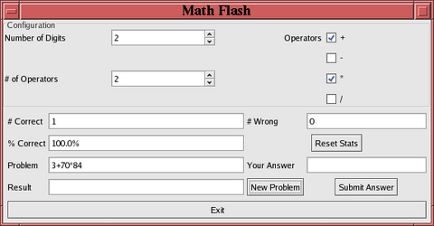 Glade and GladeGen automate much of the tedious, repetitive work that goes into creating graphical programs by removing the need to write code to create and store widgets and set up the callback functions. This allows for rapid application development of Python/GNOME/GTK applications. The finished Math Flash is shown in Figure 2. The GladeGen software can run on any system that supports Python and GTK, including Linux, UNIX, Mac OS X and Microsoft Windows.