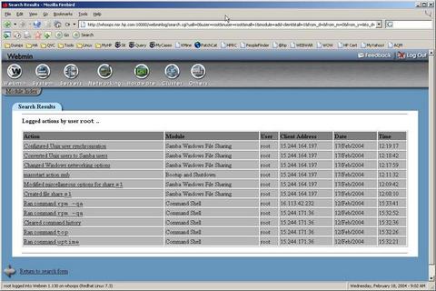 I've opted not to secure my machine as best I can, but that doesn't mean I don't want to know who was logged on when and why. By default, root's actions are logged, so if you have several folks using root, you can look at what they did. In Figure 2, one can see from the IP addresses that the root user was logged in from different clients.