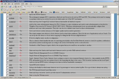 Modules is a topic larger than what I can cover in the scope of this article, but I mention a few of the modules so we can sample the span of Webmin. The first of these modules after the Webmin (configuration) one is the System module. The first of the subsystems to look at is Bootup and Shutdown. The page should display Actions, Start At Boot and Description columns. This enables you to quickly disable services. For example, I typically disable sendmail by starting on this test box, unless I have a specific need for messaging. You should notice a red No in the Start At Boot column (Figure 3).