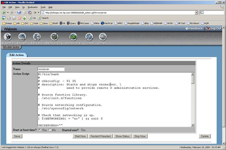 With that, a new page would load that displays, in editable form, the vncserver startup script (Figure 4). This page allows for stopping, starting, restarting, setting boot time start and editing the file. Once you save or delete the action, you return to the Bootup and Shutdown page.