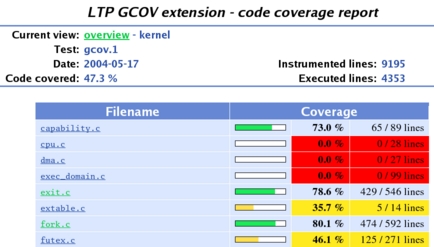Also, because the kernel is not linked with standard C libraries, many of the GCOV structures are not present in the kernel. The LTP has published a GCOV-kernel patch to the Linux kernel that addresses these issues and allows developers to use the existing GCOV tools to gather coverage data from a running kernel. Installation instructions as well as a detailed description of the functionality provided by the patch can be found at the LTP Web site and in an Ottawa Linux Symposium paper by Paul Larson and others.