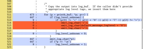 genhtml is one of the LCOV tools and generates HTML output at both the directory and file level, as illustrated in Figures 1 and 2. Figure 1 is a partial screenshot of the Linux kernel source subdirectory. In this example, the total amount of code covered for the directory is 47.3%. Each line shows a filename. A color-coded meter is used to represent the amount of coverage for the file: green for files with 50% coverage or greater, yellow for files with coverage between 10% and 50% and red for files with less than 10% coverage. The last two columns show the percent coverage for the file and number of lines executed over the total number of lines instrumented. Both figures are displayed on a color-coded background. Figure 2 is a partial view of a printk.c file. This is a graphical view of the original GCOV output. A similar color coding is used to allow you to identify under-utilized code quickly. At this time, LCOV output shows only statement coverage and not branch coverage.