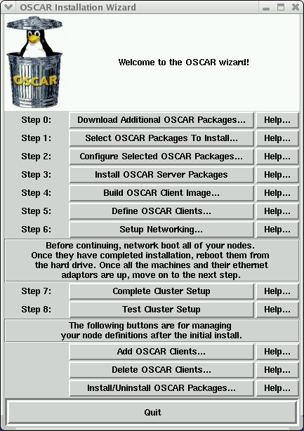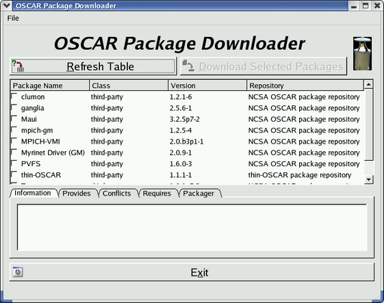 OSCAR comes with many prebundled packages. Other packages available from the various repositories also may be of interest. To download those, simply click on Download Additional OSCAR Packages in the OSCAR Wizard and choose the package(s).