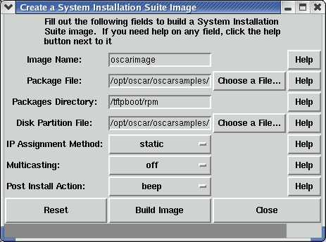 Now the fun part begins. You can build a client image with the Build OSCAR Client Image step. In this step, you select a few options for the client image you want to build. This image then is pushed to your client nodes. You can provide a list of RPM packages to be installed on the base image, and you also can decide how to partition the hard drive and assign IP addresses. Lastly, you can choose the post-image action, such as rebooting the machine when imaging is done.