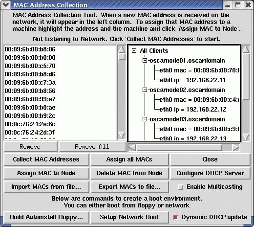 Next, you will want to set up networking for your cluster. Here, you can boot up your client nodes with PXE or floppy disk, and the OSCAR head node then collects the MAC addresses and you can assign them to particular hosts. Once this is done, the client nodes are imaged immediately. Typically, it takes anywhere from 10–30 minutes to image each node, depending on the speed of your hard drive. When deploying a cluster, multiple nodes can be imaged at the same time. We usually start up ten nodes to be imaged at a time so the head node does not get heavily loaded. With this staggered approach, you should be able to deploy a 64-node cluster within an hour.