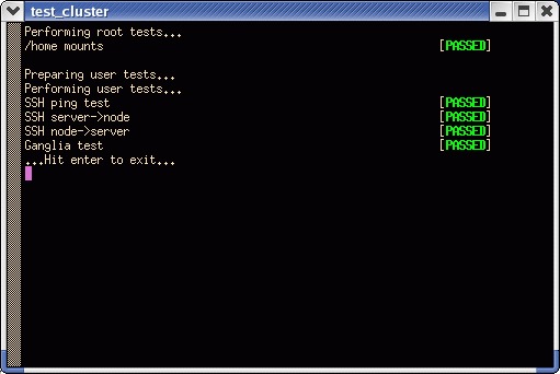 Lastly, you may want to Test Cluster Setup. This runs a series of tests for the cluster install as well as for individual packages. If all goes well, you will pass all the tests, thus confirming your cluster setup is complete and ready to run computations.