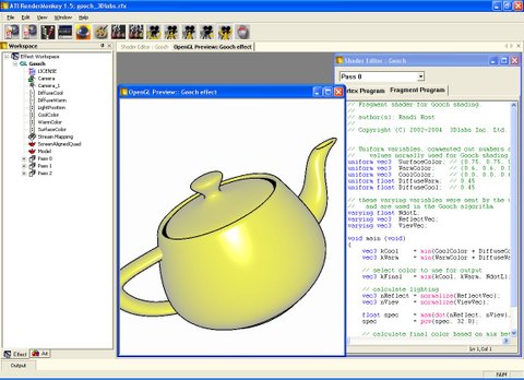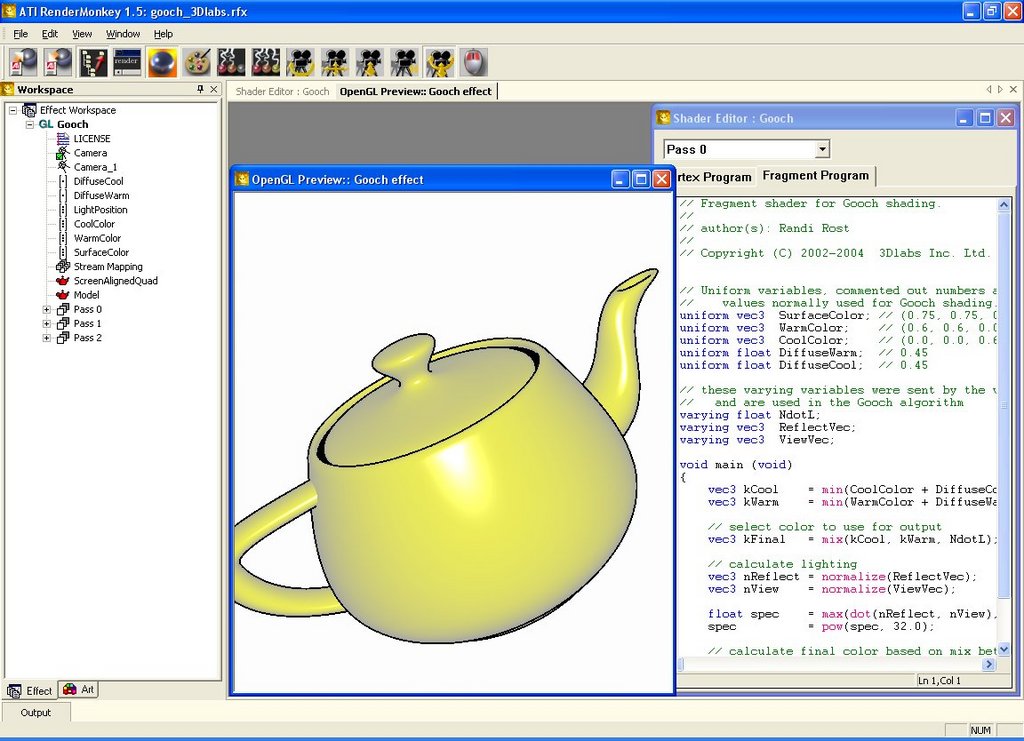 RenderMonkey 1.5 is an integrated, real-time OpenGL Shading Language development environment with a graphical user interface used to write and adjust shader attributes, such as the definition of color, textures, graphics states, scalars, vectors and matrices. It eliminates the need for handwritten OpenGL Shading Language programs for many visual effects. The shader development tool supports a plugin architecture that enables developers to create new, customized components as needed. RenderMonkey works with a number of shading languages, including OpenGL's, HLSL and assembly-level languages. Shaders and their attributes are stored in XML files for interchange with other applications.