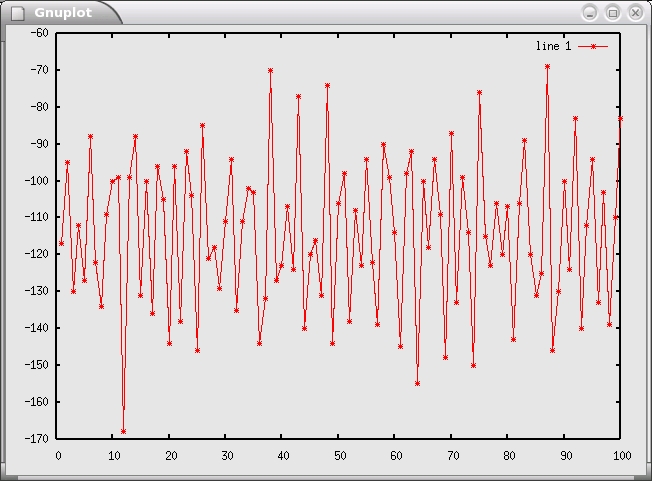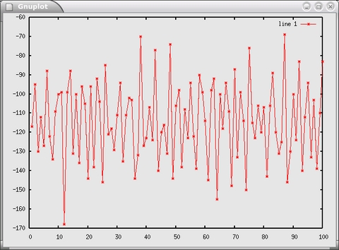 First off, let's take a look at what happens when we tune our front end to the middle of the FM band, say 100.1MHz. Figure 2 shows the received samples vs. time. This view, the time domain, is what you'd see on an oscilloscope. It's not particularly enlightening, but it does show that our samples are in the range of –170 to –70, which is fine. In an ideal world, they would be symmetric about zero. For our purposes, the offset won't matter.