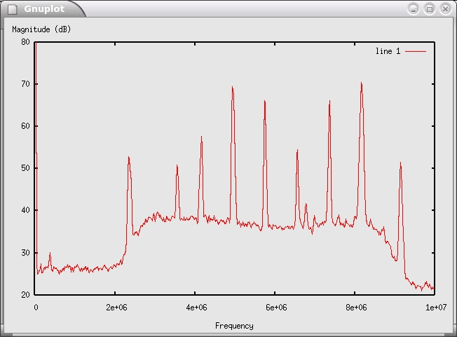 The frequency domain provides additional information. In this case, we grab 1,024 samples at a time and compute the discrete Fourier transform using the fast Fourier transform (FFT) algorithm. This gives us a representation of the frequencies that are contained in the input signal. Figure 3 shows the resulting spectrum. The x-axis is frequency, and the y-axis is power in decibels (10 * log10 power). The low end is at zero Hz, and the top end is at 10MHz, half our sampling rate.