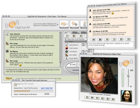 DigiChat AV Enterprise 5.0 is Java software that enables Web-based chatting, on-line collaboration, e-learning and moderated Webcasts. Features of version 5.0 include voice chat (VoIP), video chat (P2P), Web-based instant messaging support, a GUI with skinnable interfaces, a high-performance text messaging engine, HTTP tunneling support, scriptable BOTs support and scriptable command-line and Java APIs. The new client-side plugin architecture allows users to extend and create new programs within DigiChat. Version 5.0 also offers an integrated IM application that can be installed locally. Users can share text documents, PDFs, images, sounds and video directly through DigiChat. DigiChat supports UNIX/Linux, Windows 9x/NT/2000/XP, Mac OS/OS X and Solaris.