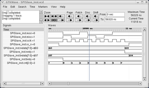 MyHDL supports waveform viewing, a popular way to visualize hardware behavior. In Listing 2, the instantiation of the SPI slave module is wrapped in a call to the function traceSignals. As a side effect, signal changes are dumped to a file during simulation, in a standard format. Figure 1 shows a sample of the waveforms rendered by gtkwave, an open-source waveform viewer.