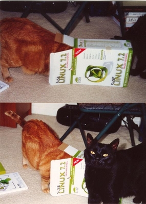 I ran across this old photo (SuSE 7.2) and thought you might like it for your magazine's Letters section. As you can see, my cats enjoy a new distribution of Linux just as much as I do—or at least the box!