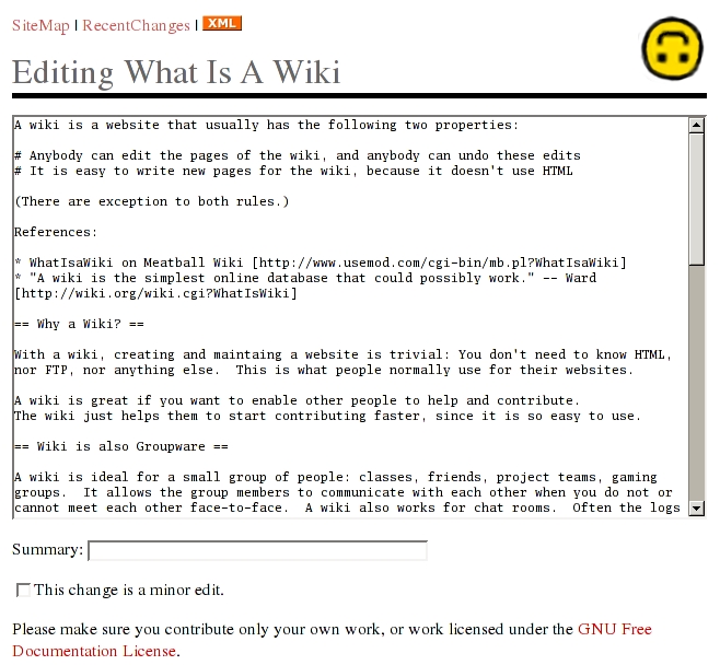 As an example of how easy it is to contribute content to a wiki, let's say you are reading, on some wiki Web site, an article about rodents. You notice that, although it's a fine article, it fails to mention the world's largest living rodent, the capybara. To correct this omission, you click the Edit text of this page link, after which you are presented with a standard Web form that allows you to edit the text. You do so by adding a sentence about the capybara, and when you save your changes, the new version of the article instantly is available. It's that easy.