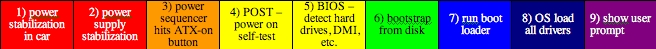 Power sequencer hits ATX-on button: This step can add time. Many motherboards now have a wake on power loss feature (technically a wake after power loss) that makes them instantly start up when power becomes available. However, many power sequencer/shutdown controllers, which make sure computers turn on and off with the car, tend to add delays to start-up. They usually give the power supply 2-3 seconds to fully stabilize its voltage at 12V; if this doesn't occur, the motherboard can hang on boot. (Cost: up to 3 seconds)