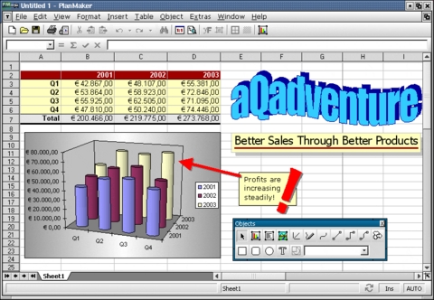 PlanMaker 2004 is spreadsheet software that operates on various OSes, including Windows and Linux, and offers the same feature set on all platforms. It also can operate on pocket and handheld PCs, as it requires limited RAM space. Over 320 calculation functions are built-in and cover areas such as date and time calculations, mathematics, statistics and data analysis. PlanMaker also offers features for preparing presentations, including stylesheets, various formatting options, an AutoShapes drawing module and freehand drawing. Charts and graphs can be created from any of the 70 different types of 2-D and 3-D charts that PlanMaker supports. PlanMaker also reads and writes Microsoft Excel files—Excel 5.0, 95, 97, 2000, XP, Excel 2003 and Excel for Apple Macintosh—for easy and safe file exchange with Microsoft Excel users.