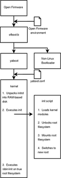 Now that we know a little bit about the firmware's view of the computer, we must spend some time investigating the software the firmware initially executes: the bootloader. Generally, Linux systems that run on Apple's PowerPC architecture employ a program called yaboot to boot the system. yaboot is similar to LILO or GRUB and contains two key programs, ofboot.b and yaboot. ofboot.b provides the first stage of the bootstrap process. Essentially, it is ofboot.b's job to determine what operating system to boot. For example, if a system has both Mac OS X and Linux installed, ofboot.b executes Mac OS X or Linux's bootloader. If the user chooses to load Linux, ofboot.b executes yaboot, the second stage of the bootstrap process. yaboot then loads the Linux kernel and, in our case, an initrd. Figure 3 provides a illustration of how Linux boots using an encrypted root filesystem on the PowerPC architecture.