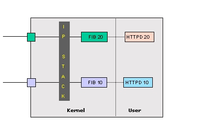 Consider the example (see Figure 2) of having two HTTP servers serving two different networks with potentially the same IP address. One HTTP server serves the network/FIB 10, while the other HTTP server serves the network/FIB 20. The advantage gained is to have one Linux box serving two different customers using the same IP address. ISPs adopt this approach by providing services for multiple customers sharing the same server (server partitioning), instead of using a server per customer.
