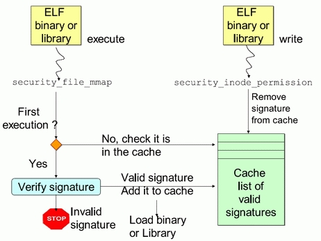 DigSig, a component of DSI, is one implementation of such a feature. DigSig is a Linux kernel module that checks the signature of a binary before running it. DigSig inserts digital signatures inside the ELF binary and verifies this signature before loading the binary. It is based on the Linux security module (LSM) hooks. LSM has been integrated with the Linux kernel since 2.5.x and higher.