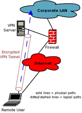 In Figure 1, the dashed-blue data flow implies access to the entire corporate LAN. In practice, a remote-access VPN tunnel can limit that access through access control lists (ACLs) or firewall rules. Access can even, in the case of SSL-VPN, be limited to a single application on a single host (I'll explain SSL-VPN shortly).