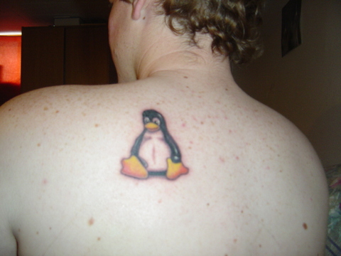 Hey, I am just sending this picture in to share. It is a picture of the Tux tattoo I got on my back. In the picture it's pretty red, but that's because the picture was taken a few hours after it was done. The tattoo artist said two seconds after he finished, in his big burly voice, “DUDE! It's cute!” I responded with, “You mean it looks bad ass and powerful?” He laughed and I went home.