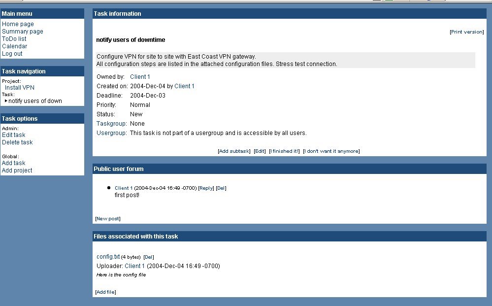 The project and task views are where the software really shines. As mentioned before, each has its own file upload section and message board. This is where the collaborative aspects of WebCollab really set it apart from a traditional to-do list. Users can ask each other questions, make comments, upload relevant documents and much more. This is what separate WebCollab from task management applications and makes it more of a project-oriented groupware. I find the message board element of WebCollab to make things more interactive and thus more interesting for everyone involved.