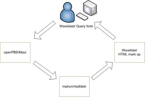 Figure 1. When a query comes in from the Web, WWW BLAST submits a job to OpenPBS. OpenPBS starts the job with mpirun and WWW BLAST formats the results.