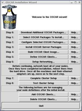 After a few moments, the OSCAR installation wizard begins to load. This wizard provides a graphical user interface and an intuitive eight-step process to complete the cluster setup (Figure 2). The only variation in our installation procedure was to set the default MPI implementation to LAM/MPI instead of MPICH. We chose LAM because it is needed for mpiBLAST to execute properly.