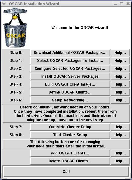 Once Red Hat was installed on the head PC, we downloaded the OSCAR 2.3.1 tarball. See the on-line Resources for installation documentation. We downloaded OSCAR into root's home directory, because OSCAR needs to be installed as root. Installing the OSCAR software was as easy as running the following commands: