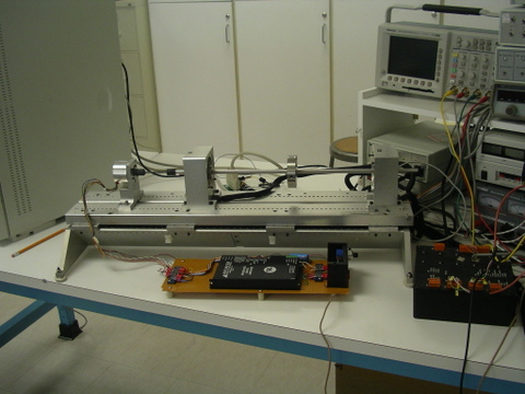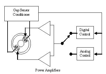 The experimental test rig, shown in Figure 1, consists of two eight-pole laminated stator assemblies, with individual windings on each of the poles. The bearing assembly includes inductive gap sensors at the centerline of each pair of diametrically opposed poles. These bearings support a two-foot-long shaft driven by a brushless DC motor. Figure 2 shows a schematic of a single axis. The controller uses the signal from the gap sensor to adjust the current from the power amplifiers driving the magnetic coils to keep the rotating shaft centered in the gap. The original controller was an analog circuit, which was replaced by the digital controller. The capability of running either the analog or digital controller is retained. The digital controller is implemented on an Intel Pentium III PC with a multichannel data acquisition board and a multichannel analog output board. The PC is configured as a dual-boot system, and the user selects plain Linux or RTLinux at startup.
