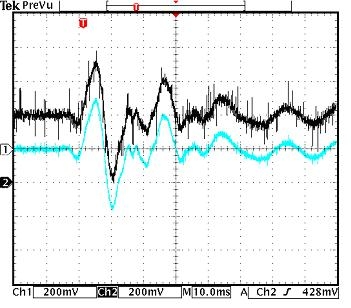 Figure 4. Oscilloscope Trace Comparing Digital (Upper) to Analog (Lower) Controller Response to a Mechanical Impulse