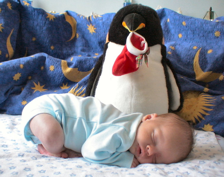 As a subscriber of Linux Journal since 1994, I have been following all the great pictures of newborns, who get their first introduction to Linux on the pages of your great publication. When my son Patrick arrived on October 23, 2004, I knew I had to start him off with penguins as soon as possible. So, on his first-month birthday, my wife snapped this picture to show that a new Linux hacker is on his way to help in the Open Source community.