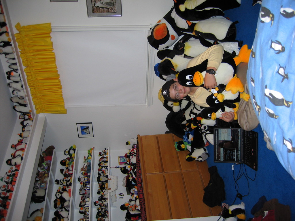 I have been using Linux since 1998 and Red Hat 5.2. My son has liked penguins since 1996. He has quite a collection of stuffed penguins including a few Tuxes. Please excuse the occasional puffin. Here he is pictured with our ThinkPad running Fedora 3.