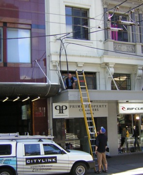 Figure 4. Cables coming off overhead trolley bus supports to a junction point on a building veranda. The ability to exchange huge files at no cost helps local businesses save money and offer new services.
