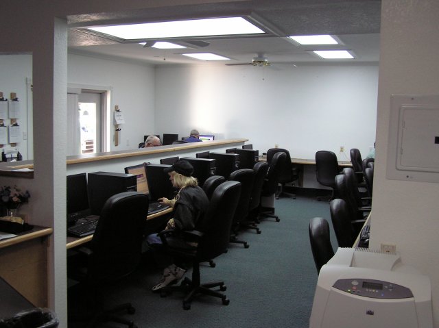 Every resident of the RV park is eligible to use the computers; however, during the winter season (Nov. 1 - March 31), only members of the club can use either printer or take classes. During the remainder of the year, access to the color printer is blocked, but the b/w printer is available. In season, the computers are available from 7AM to 9PM, seven days a week, with roughly 25,000 individual user sessions per season. This season, all 38 machines frequently are busy and more users are waiting. Club rules prevent an individual user from installing new programs, storing files on any of the computers or changing any settings. A software program that restores each machine in the middle of each night enforces these rules.