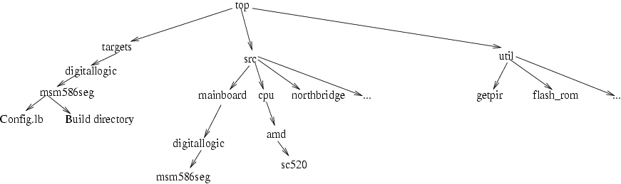 Enough overview, let's get to work. To build support for a new board, we start with the mainboard first, and the easiest way to do this is to pick a similar mainboard. Because the Digital Logic ADL855 is much like the SC520, we start with that. We can clone much of the directory structure of the ADL855 for the SC520 board.