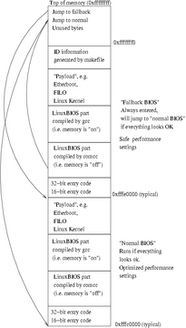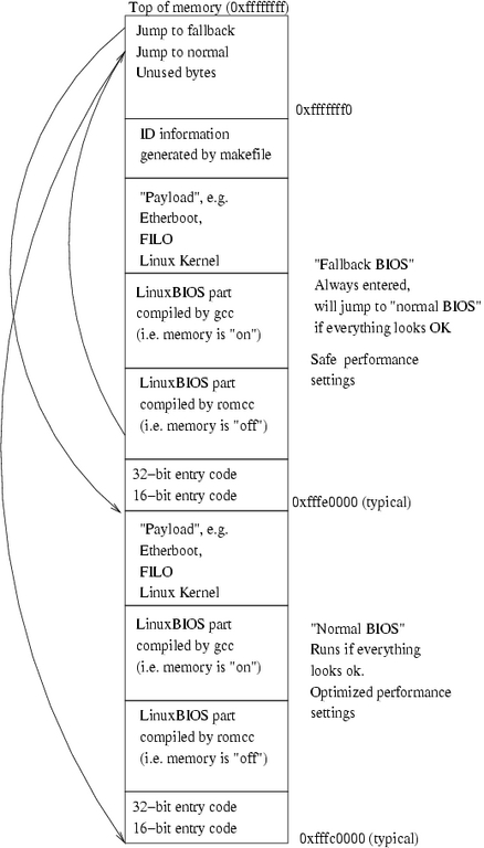 The layout of a typical ROM image is shown in Figure 2. The top 16 bytes contain two jump vectors, a jump to the fallback and a jump to the normal. LinuxBIOS always jumps to the fallback first. If all is well, it jumps back to the jump to normal vector at the top of memory, and from there to the normal image. If the fallback code detects problems or if the CMOS settings indicate that fallback BIOS should be run, the fallback BIOS runs.