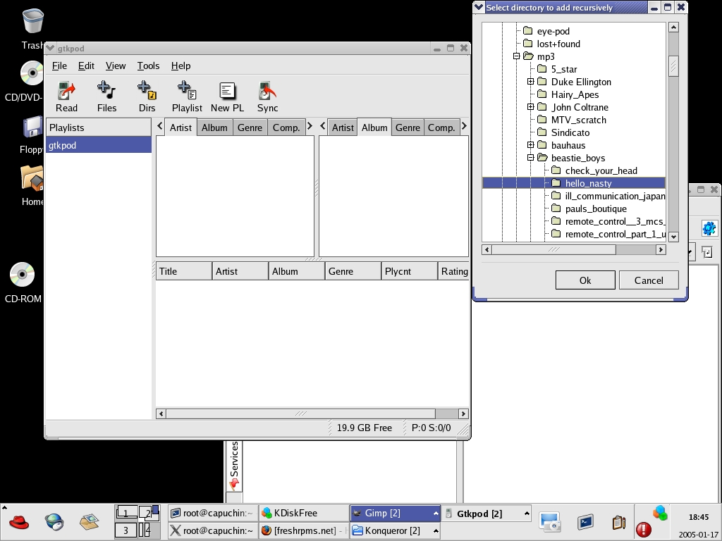 GTKPod is built on GTK2. Originally developed for use with The GIMP, GTK now is used widely in many applications and is the set of tools used to build the GNOME desktop. As sure as GTK is slick software, it also is complex software with a raft of dependencies, inter-dependencies and various requirements so byzantine that compiling the stuff yourself from source code is asking for a trip down the rabbit hole. Lucky for us all, everything you need to use GTK applications such as GTKPod should be on your computer already if you're running a recent distribution of Linux.