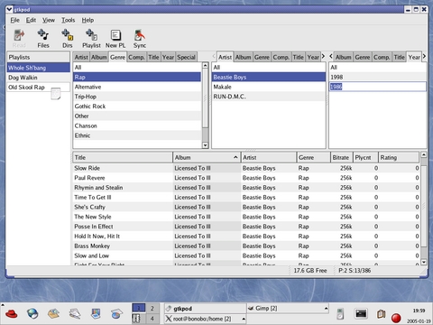 Creating playlists gives you the ability to be your own DJ and play the mixes you want when you want to hear them. I don't know about you, but nothing brightens my day quite like that old-school East coast rap. So I'm going to create a playlist for those dark days in the office when I need more of a pick-me-up than a cup of coffee can provide. I click on New PL to create my Old Skool Rap playlist and then use GTKPod to sort through my music to select the proper songs (see Figure 2). With the additional sort window pane, I can sort by genre, artist and then year. I want to hear the Beastie Boys, but only the old stuff, so I click on 1986 and drag and drop it onto my new playlist, and 13 files are copied. Now I move down to RUN-DMC and do the same. By now, I realize that I don't have enough rap ripped, so I need to fire up Grip and get to work.